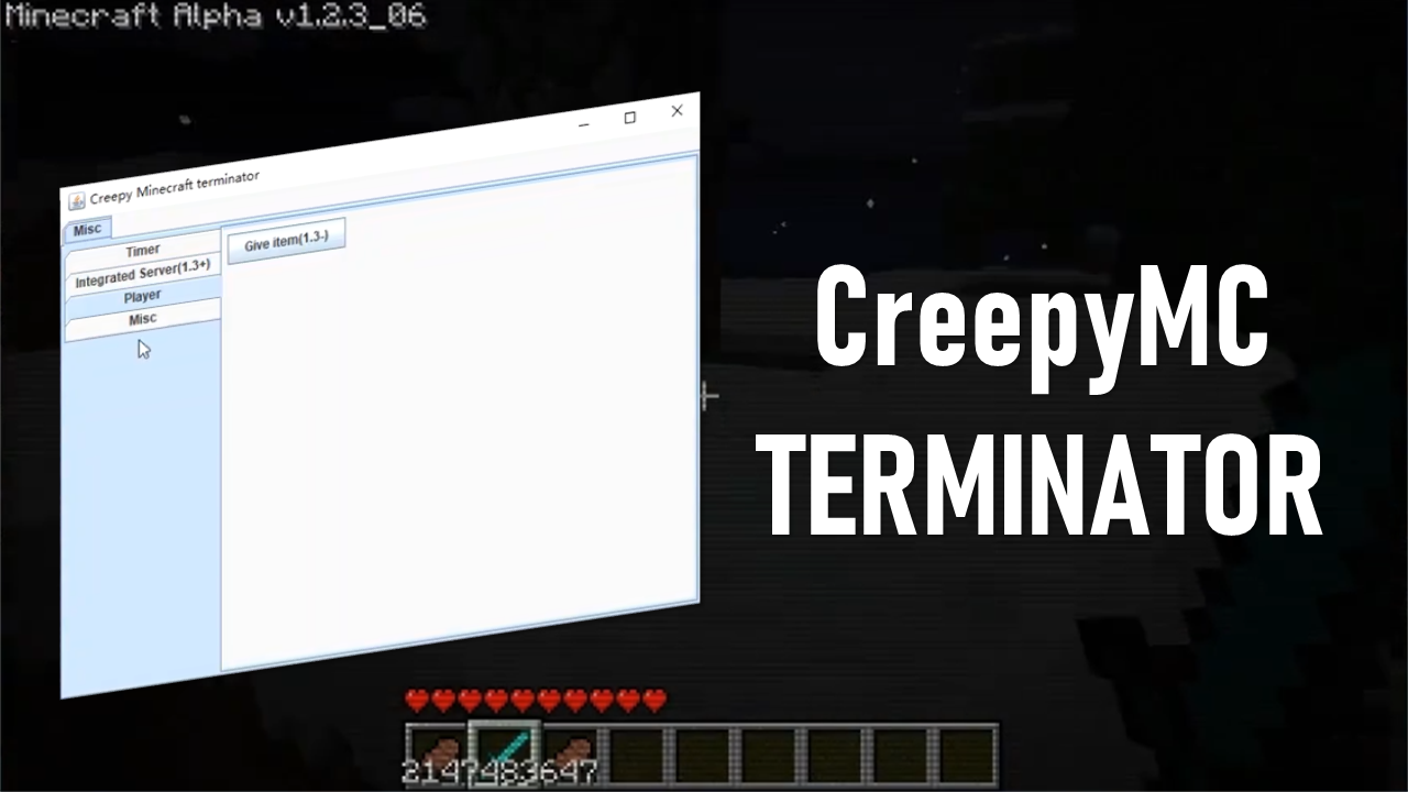 CreepyMC Terminator(都市传说Minecraft终结者、阴间版本终结者)是一个通用的Minecraft修改器。可以修改一些旧版本Minecraft的都市传说改版(比如Alpha 1.2.3_03以及著名的ERROR422)让玩家在所谓的阴间版本里获得更多的优势甚至创造模式和使用指令的权限